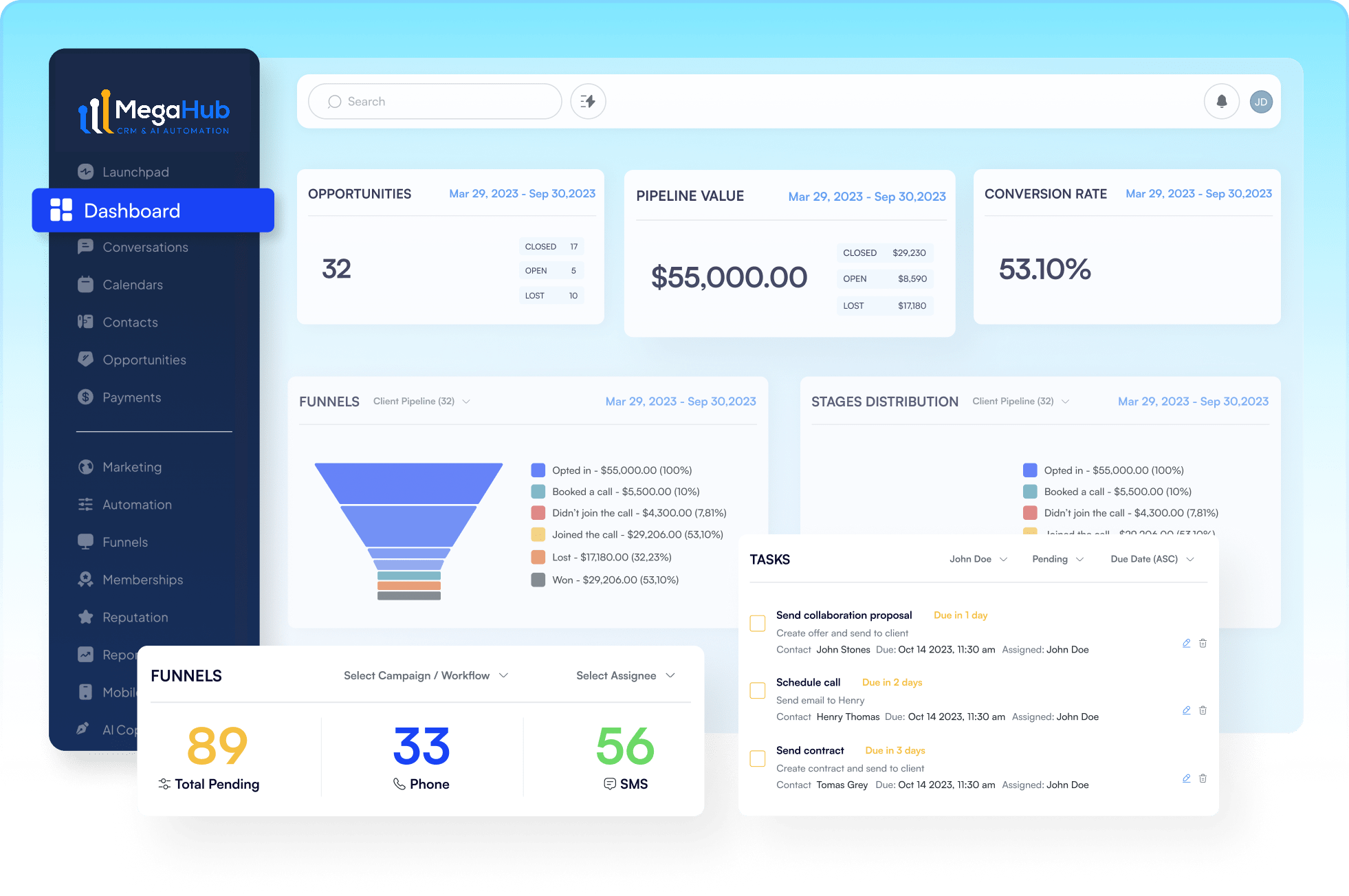 Từ tạo phễu bán hàng, chăm sóc tự động, nhắc lịch cuộc hẹn, gửi email marketing, quản lý hội thoại đa nền tảng đến báo cáo hiệu quả chiến dịch theo thời gian thực, MegaHub giúp doanh nghiệp tối ưu nguồn lực, tăng tỉ lệ chuyển đổi mà không cần đội ngũ quá lớn.